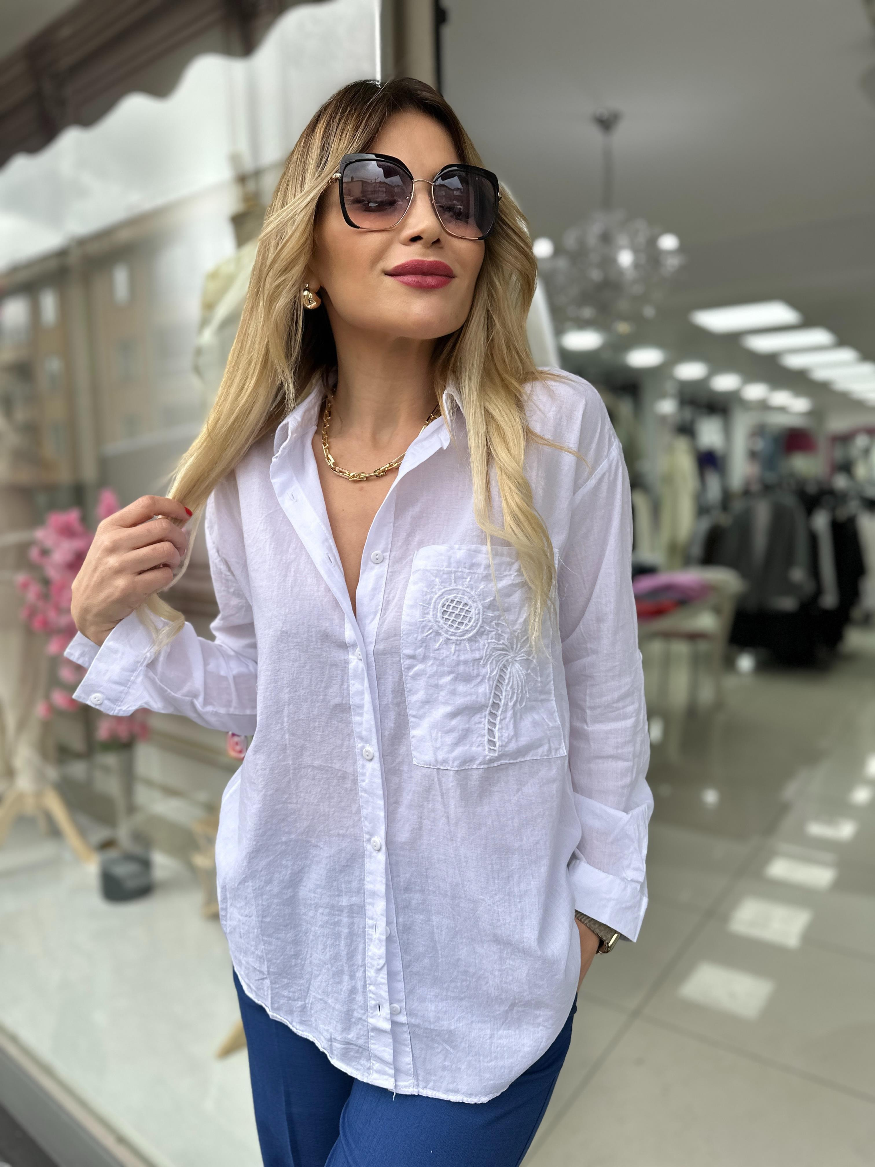 Beyaz Palmiye Desenli Pamuklu Gömlek