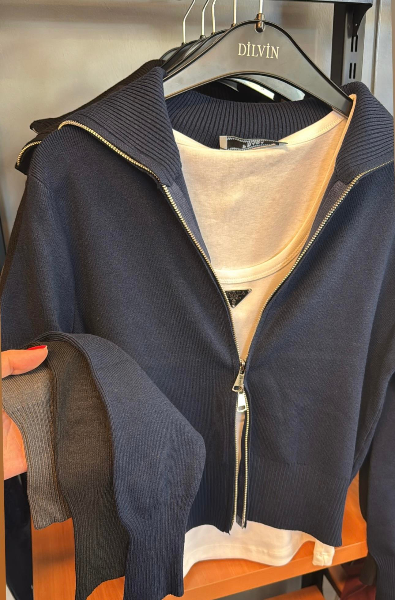 Lacivert Yumuşak Doku Çift Fermuarlı Hırka
